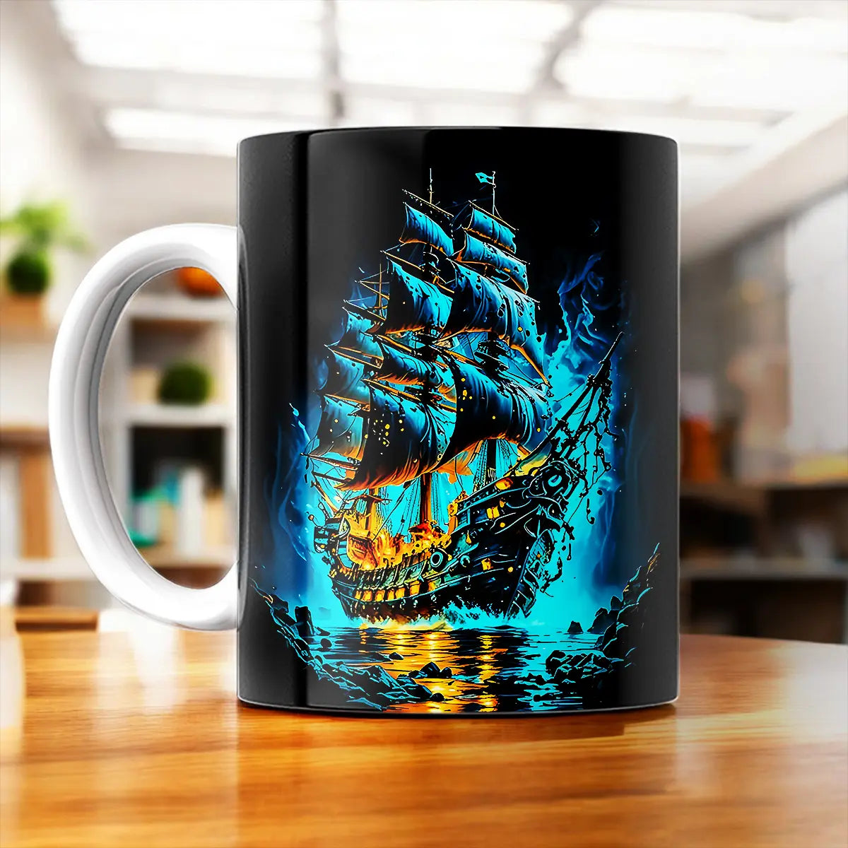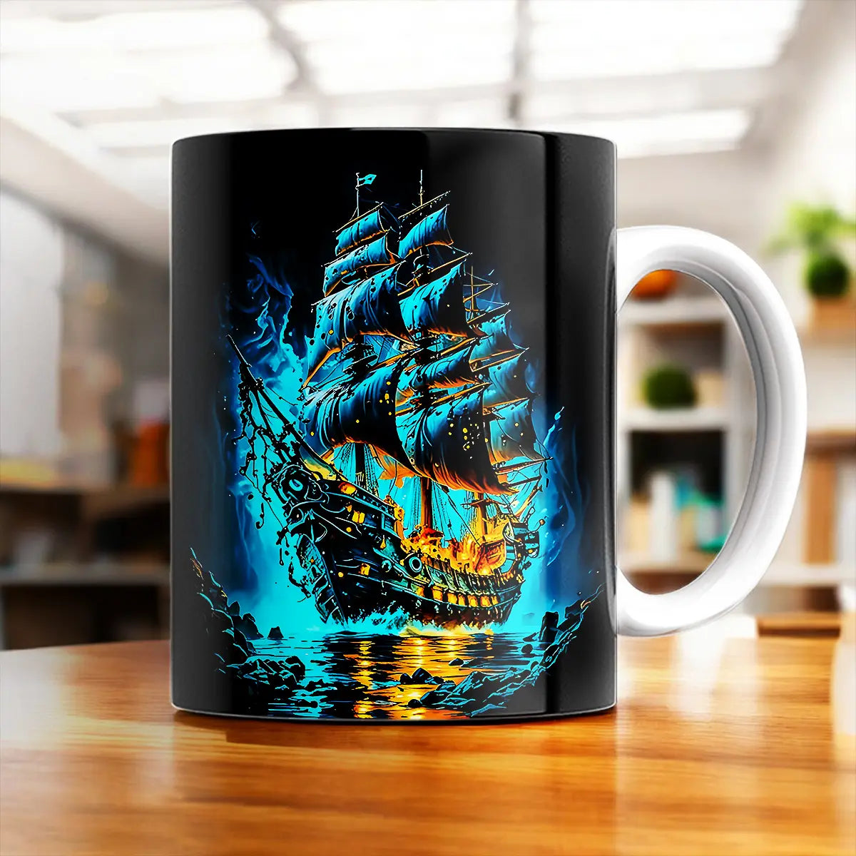 La tasse affiche un design dessiné à la main représentant un fier bateau pirate, imprimé par sublimation sur les deux faces pour une lecture parfaite quel que soit votre côté préféré. Avec ses lignes nettes et son visuel plein de caractère, elle devient vite l’accessoire du quotidien qui attire les regards au bureau ou à la maison.