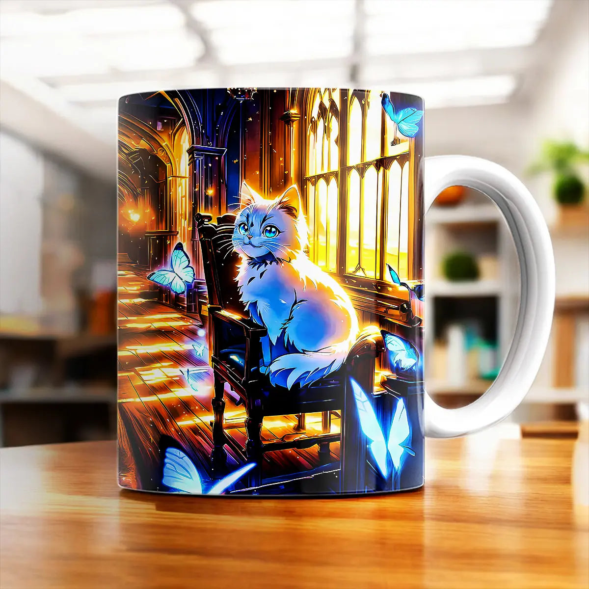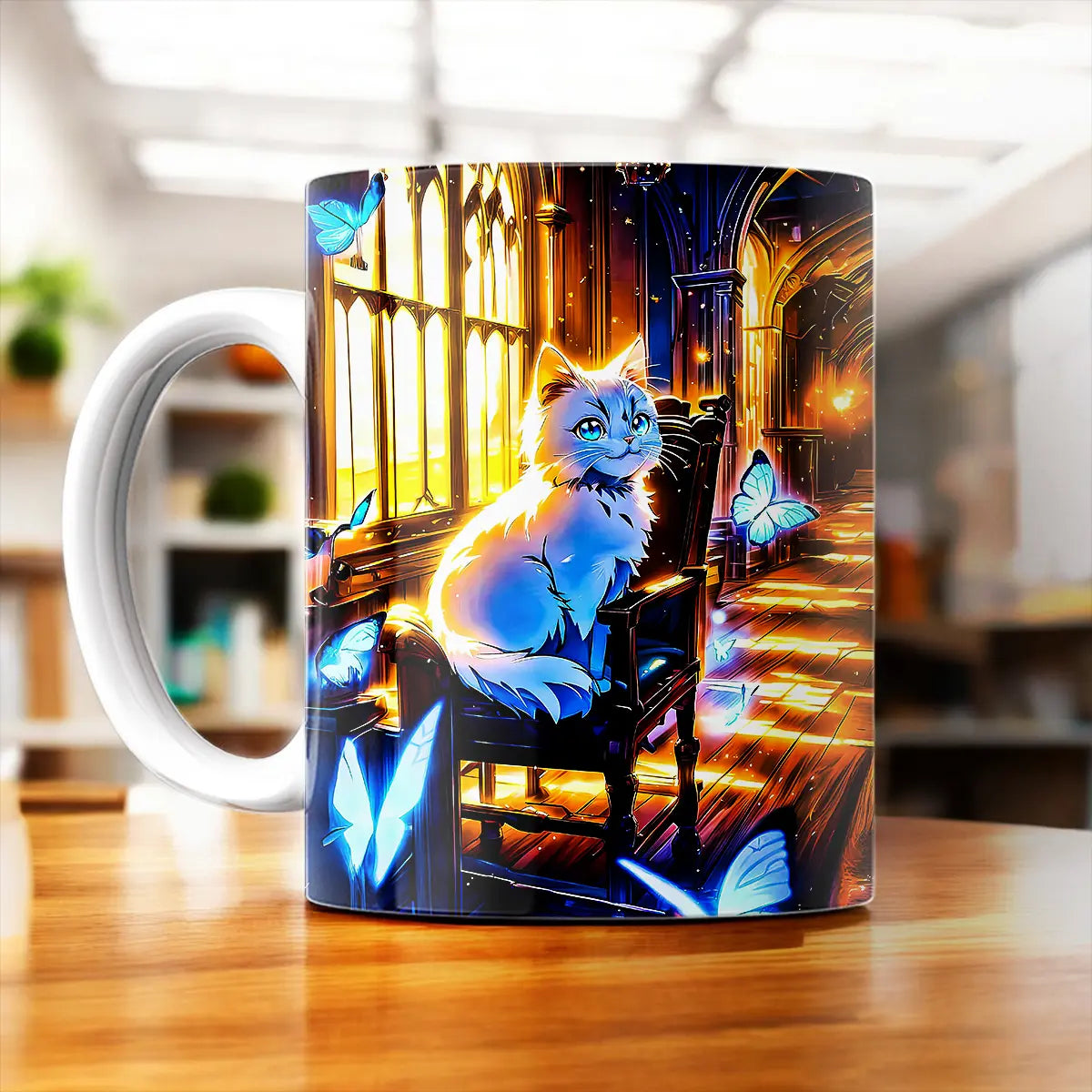La tasse Chat Papillon marie charme visuel et praticité. Le motif s’étire sur les deux faces grâce à une sublimation thermique, pour que le visuel soit visible quel que soit votre côté préféré. Contenance idéale de 325 ml, maniable, et surtout, celle qu’on ne prête pas toujours — parce qu’on est d’accord, certaines créations, on les garde pour soi.