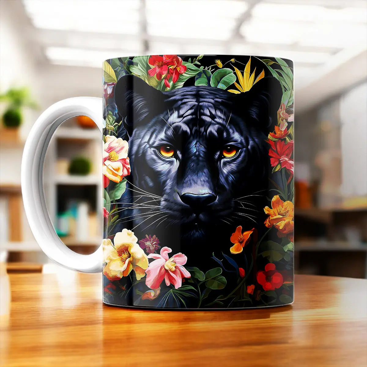 Imaginez votre pause café transformée: la silhouette mystérieuse d’une panthère se dessine parmi des fleurs tropicales vibrantes, la vapeur du mug montant comme un petit nuage exotique. Franchement, avouez que c’est le genre de tasse qui attire les regards et démarre la conversation. On est d’accord, tenir une œuvre d’art à la main rend le moment encore plus précieux.