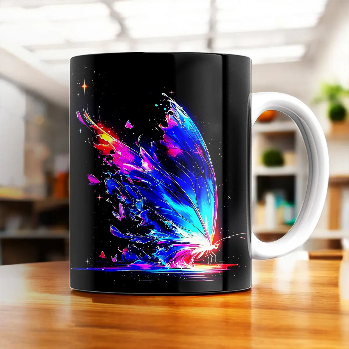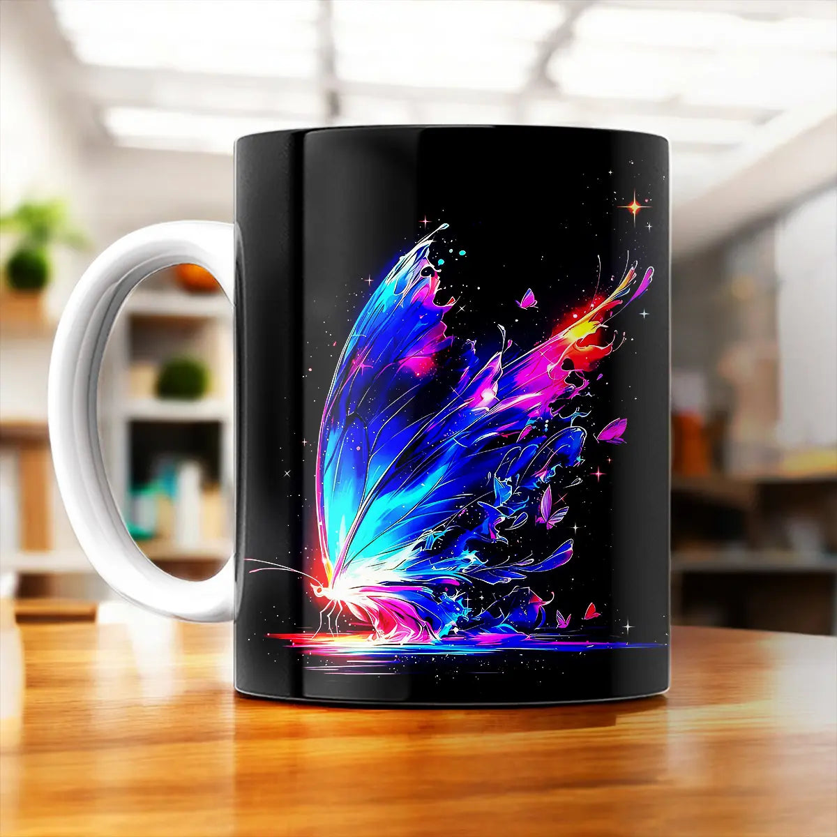 La tasse marie esthétique féérique et confort d'usage. Avec ses papillons aux ailes chatoyantes imprimés sur les deux faces, elle séduit autant les yeux que les mains. Contenance de 325 ml, parfaite pour un bon café long, un thé parfumé ou un chocolat onctueux. On est d'accord, elle accompagne vos routines et vos petits rituels comme une fidèle compagne.