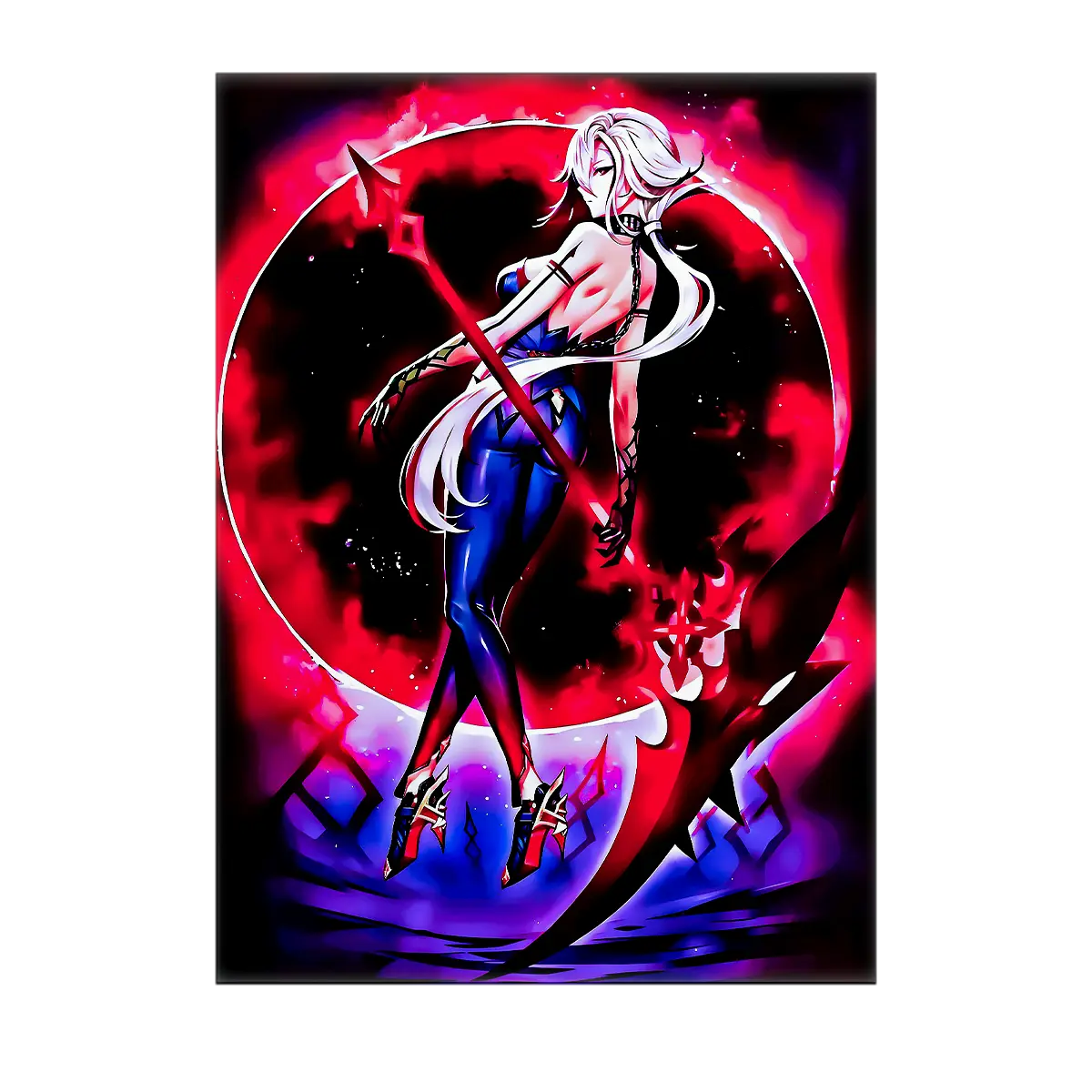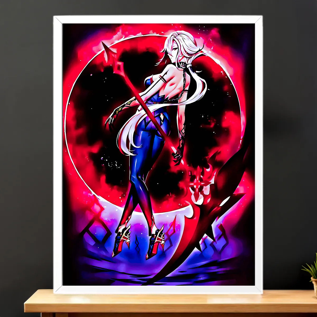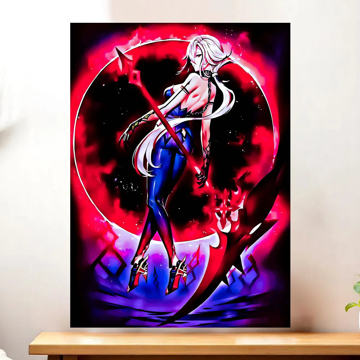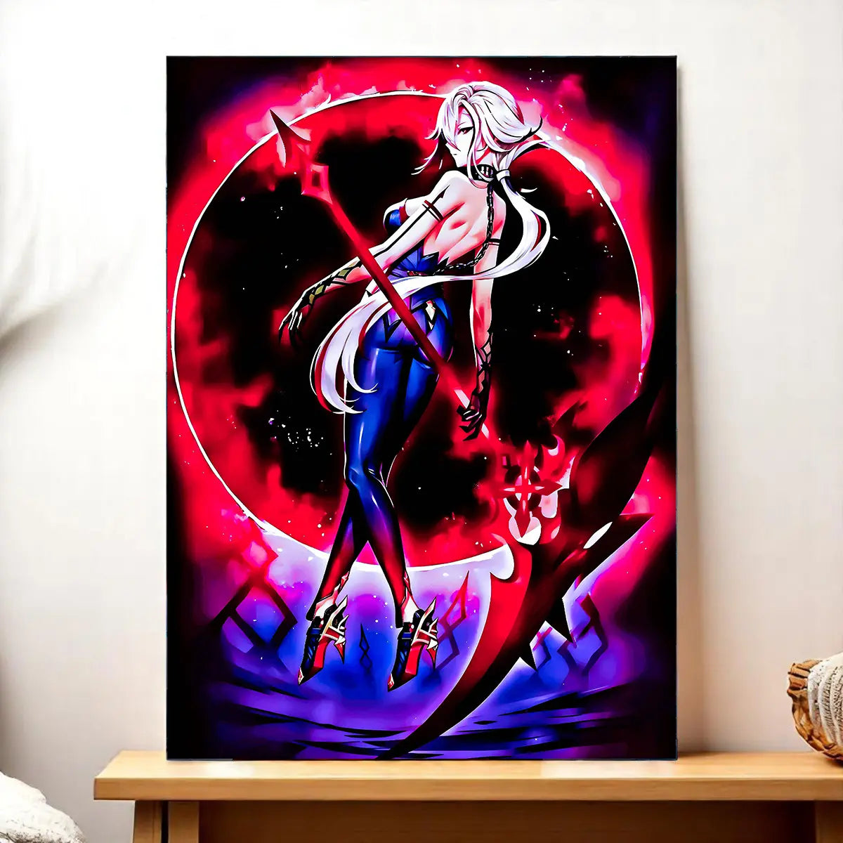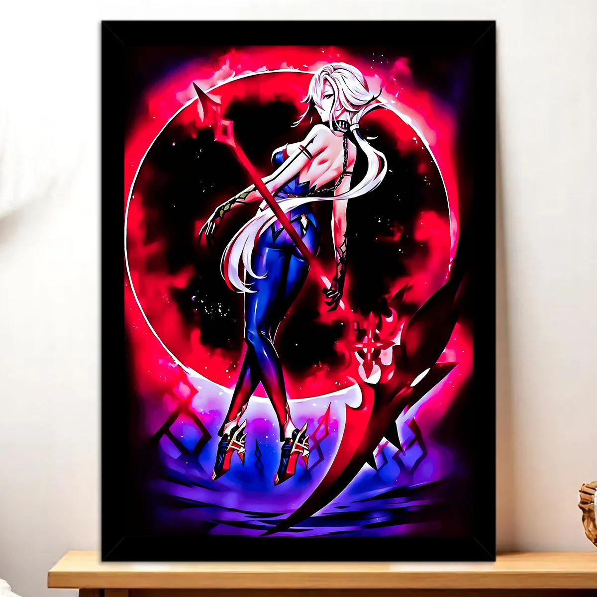 Le poster Arlecchino joue la carte cinématographique. Plus vaste, plus immersif, il restitue l’atmosphère lourde et calculée de la stratège Fatui. Accroché au-dessus d’un bureau, il donne ce côté scène où chaque ombre raconte une intrigue. On sent presque le bruissement des étoffes et les murmures des complots.