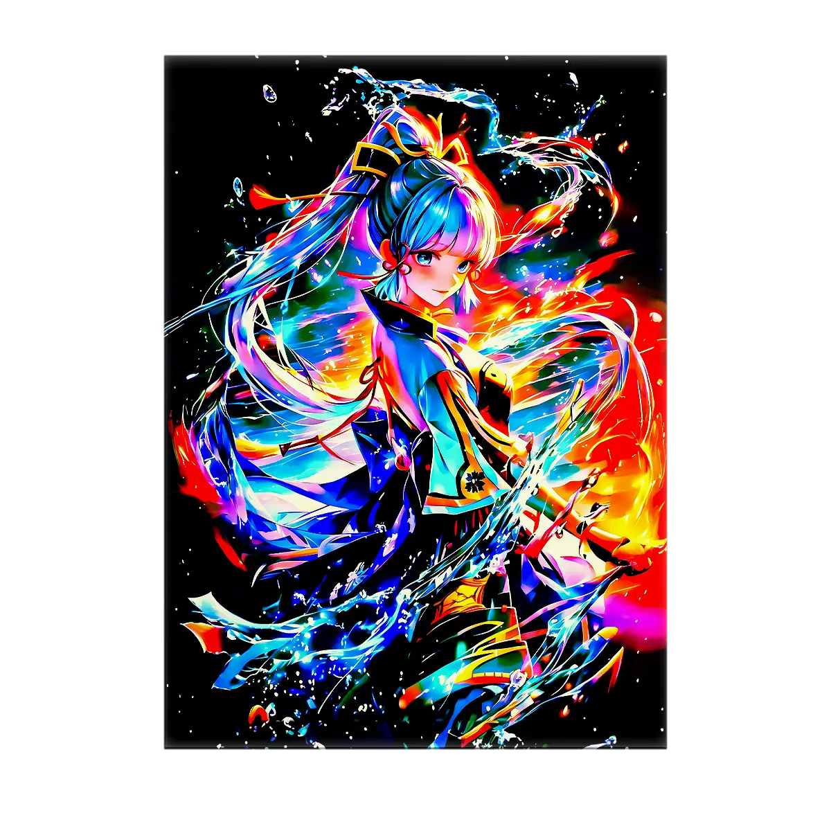 L’affiche reprend le visuel en haute définition sur papier photo 200g. Les couleurs Cryo restent nettes, les dégradés de bleu et d’argent scintillent sous la lumière et l’illustration prend une allure délicate sur un mur nu. Parfaite pour les cadres modulables et les collections d’affiches d’univers japonais.