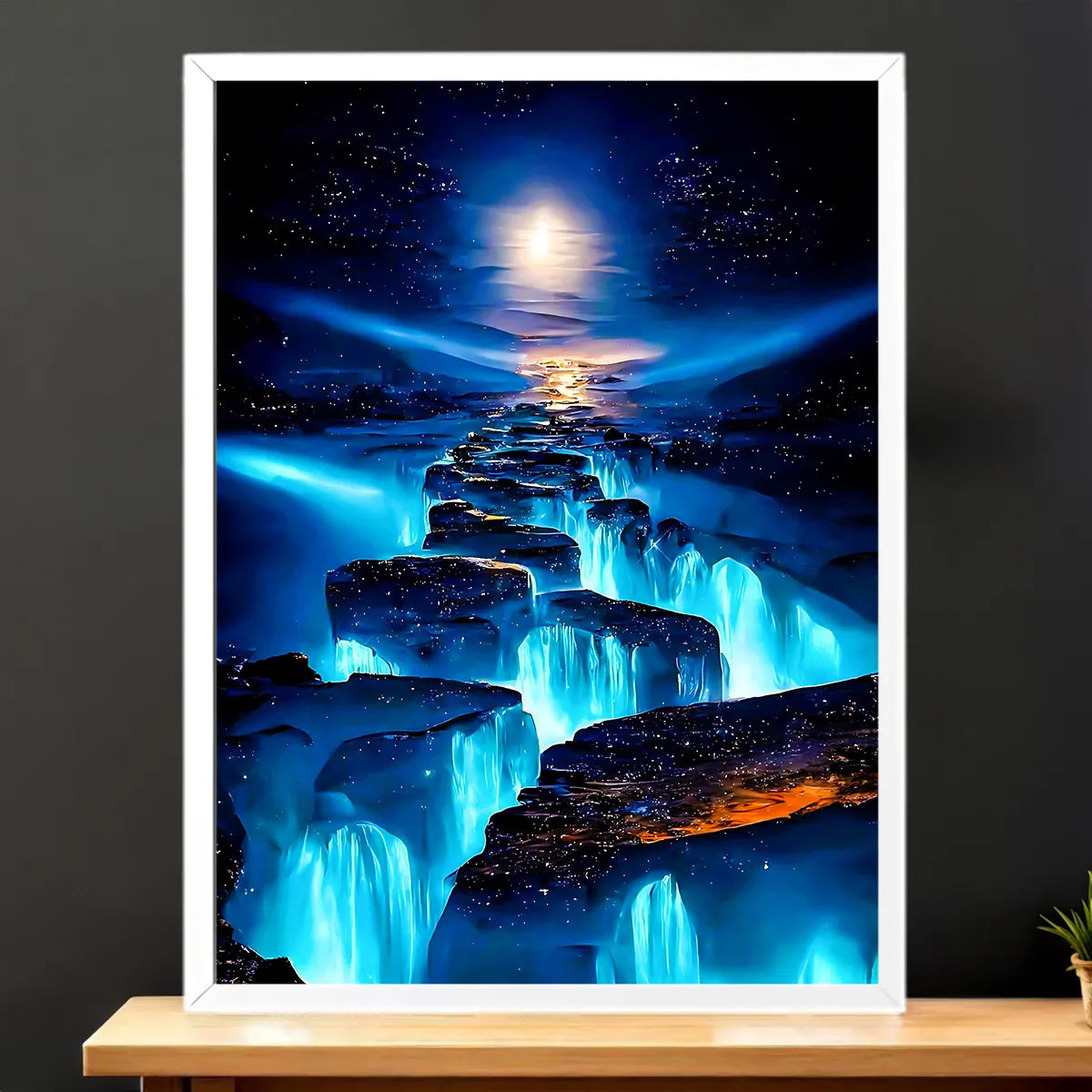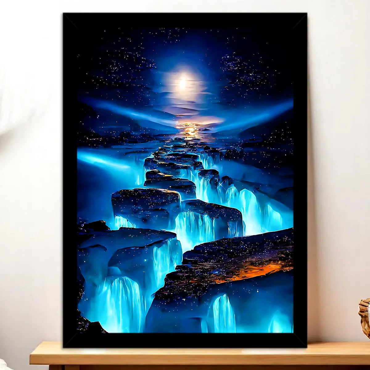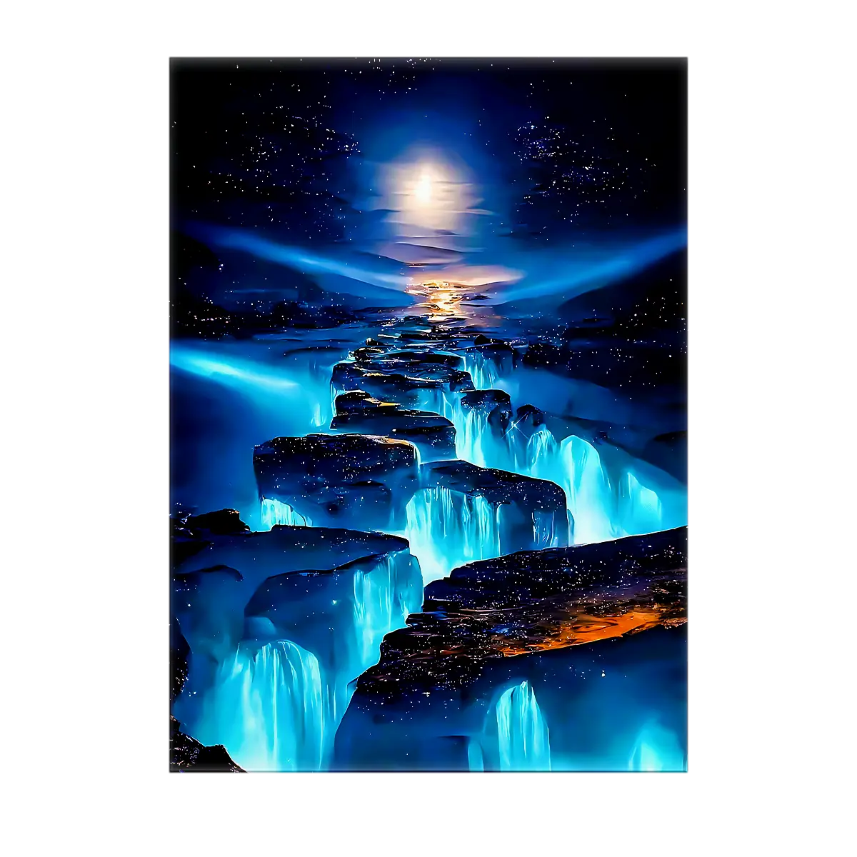 Le tableau est proposé en toile tendue sur châssis bois FSC, format 21×29 cm. La texture de la toile ajoute de la profondeur à la scène, la lumière joue sur les pigments et la cascade paraît presque vivante. Idéal pour poser sur une étagère, suspendre dans un couloir ou offrir à un ami qui aime la nature.