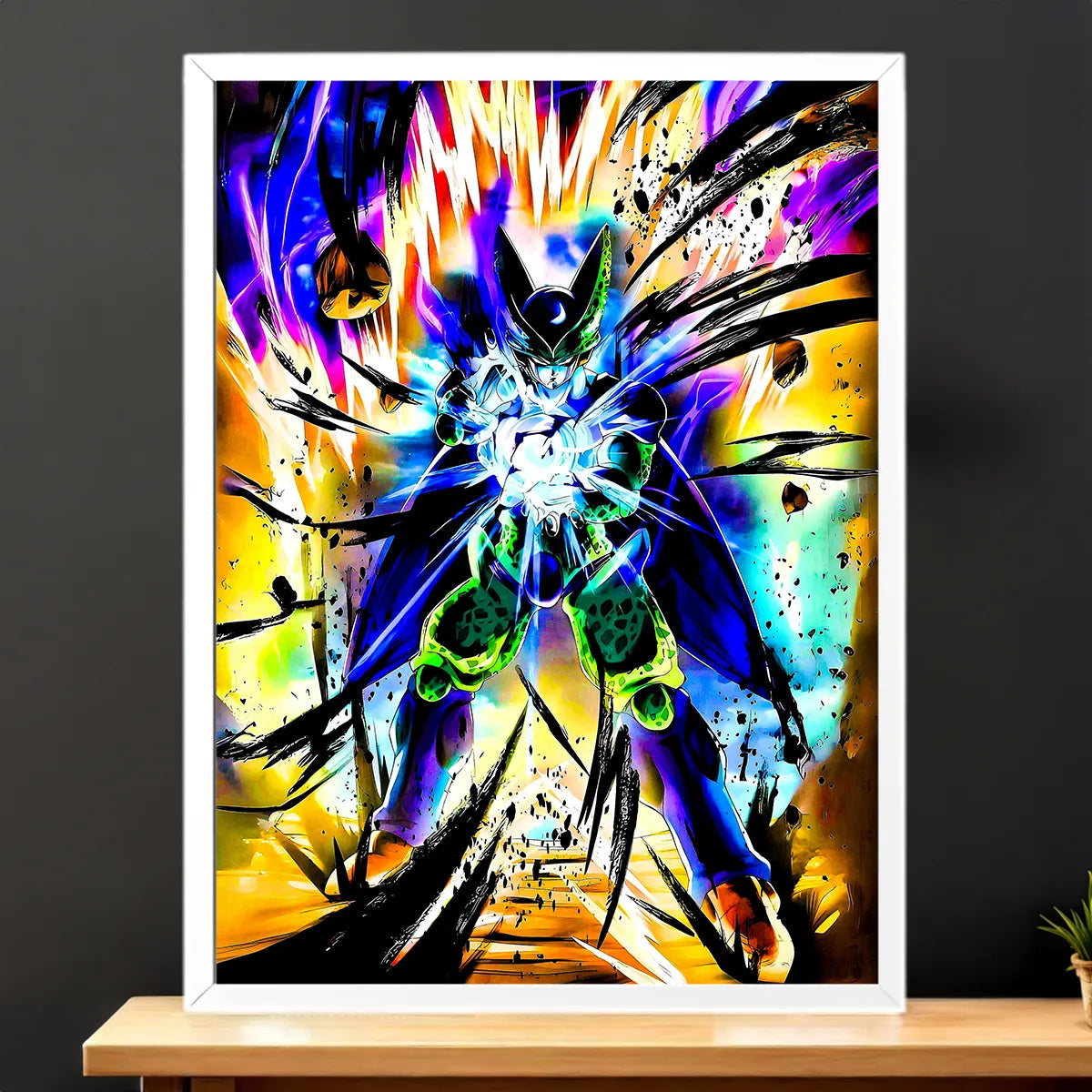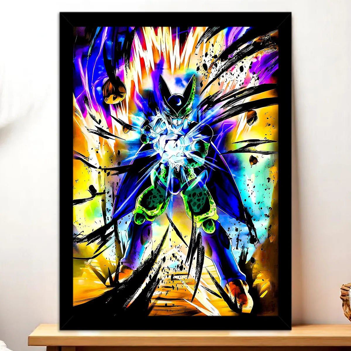 Le poster joue la carte cinéma. Plus grande présence, plus d’impact, une ambiance dramatique qui transforme un mur banal en scène de confrontation. Impression soignée, grain maîtrisé, c’est la version pour les fans qui veulent que Cell domine la pièce comme sur grand écran.