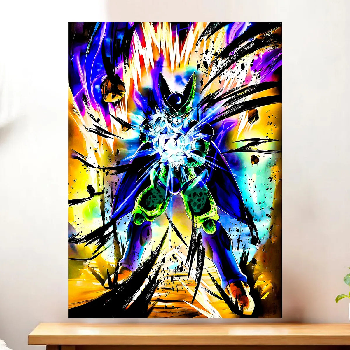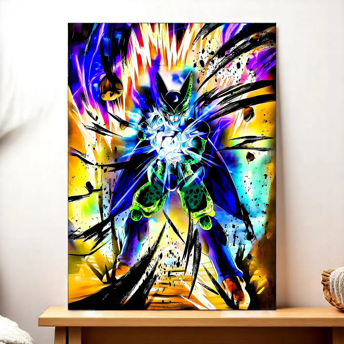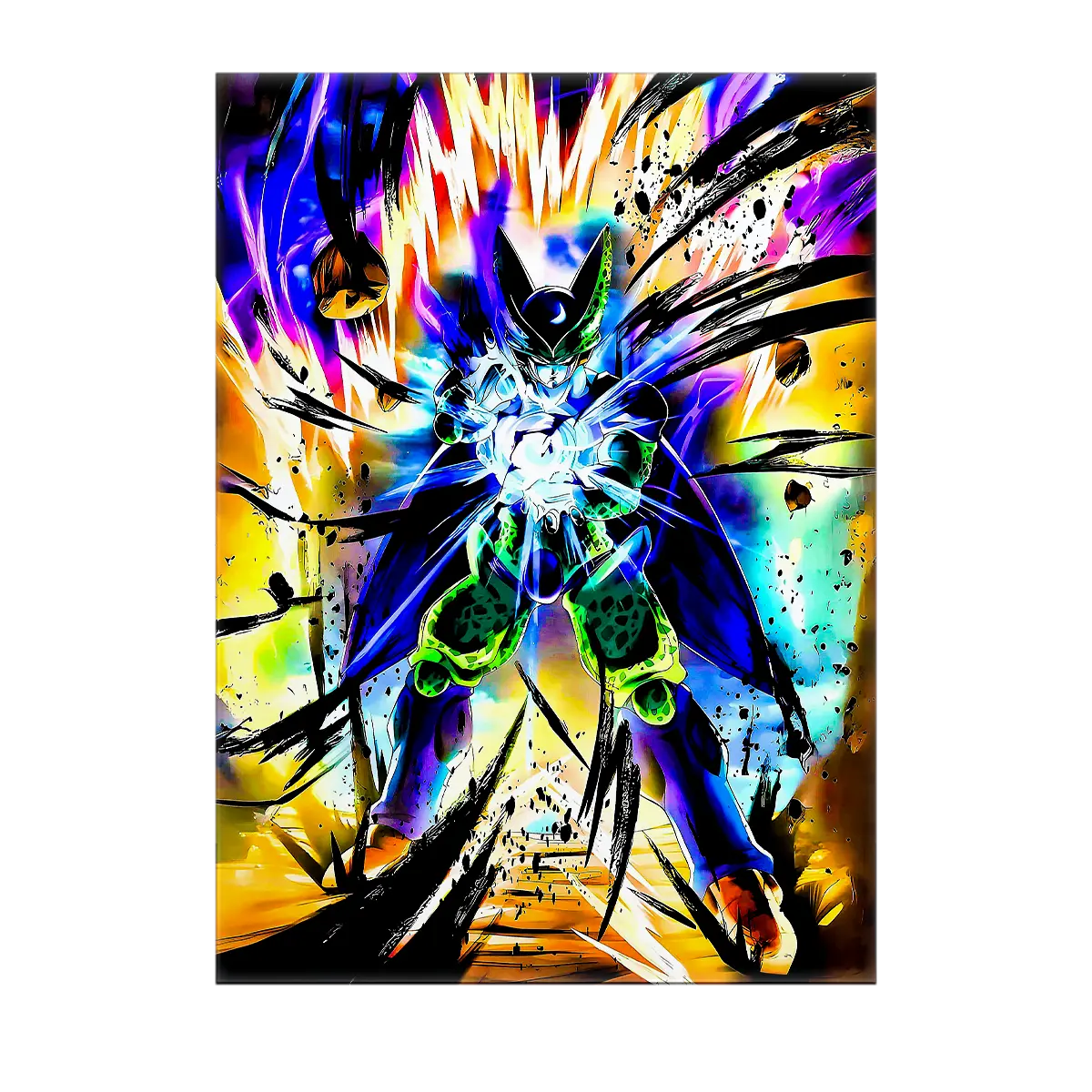 Le tableau est proposé en toile tendue sur châssis bois certifié FSC, format 21×29 cm. La toile offre une profondeur de texture, un grain subtil qui met en valeur l’armure organique et les reflets de la peau de Cell. C’est l’option parfaite si vous cherchez une œuvre prête à accrocher, avec un rendu artistique et une allure authentique.