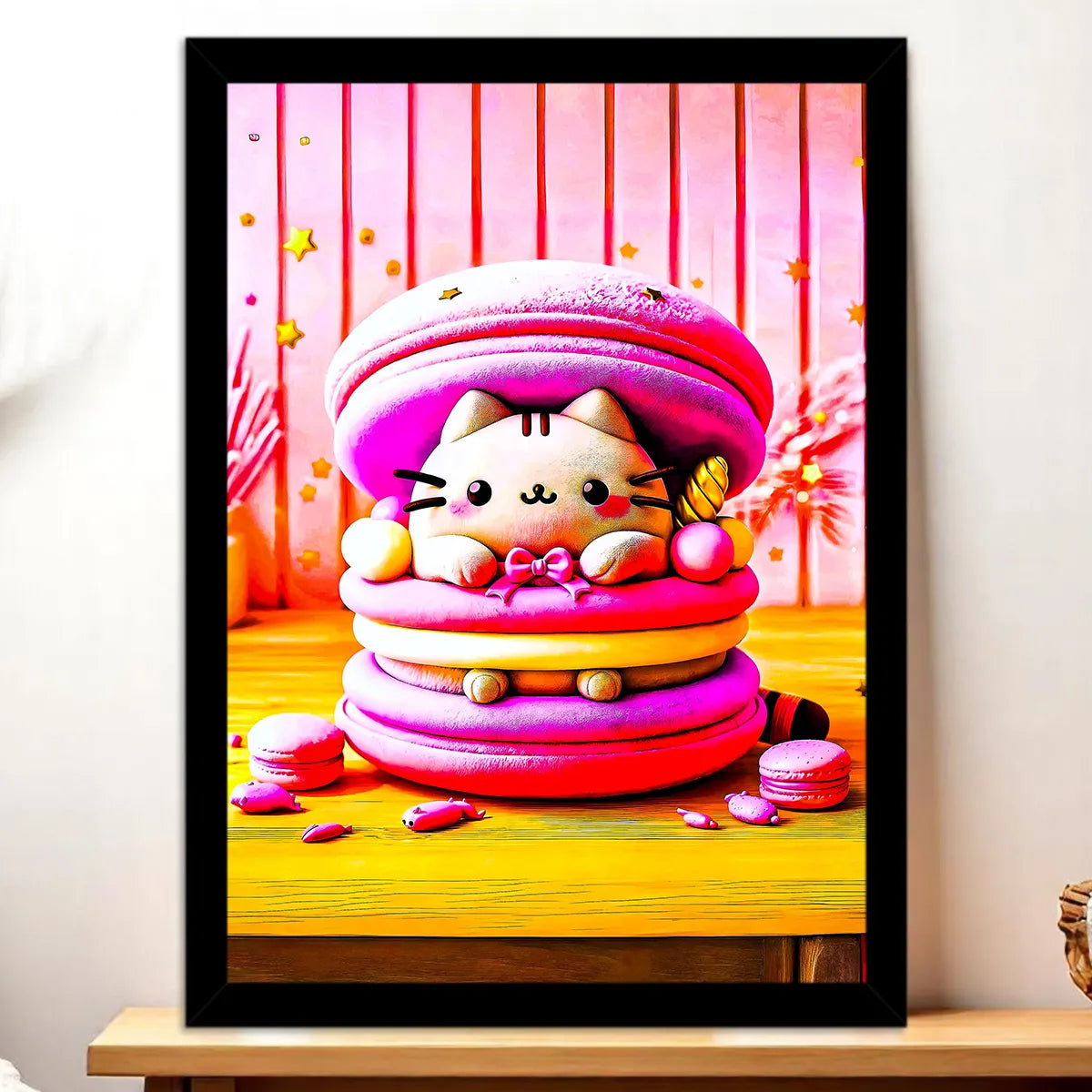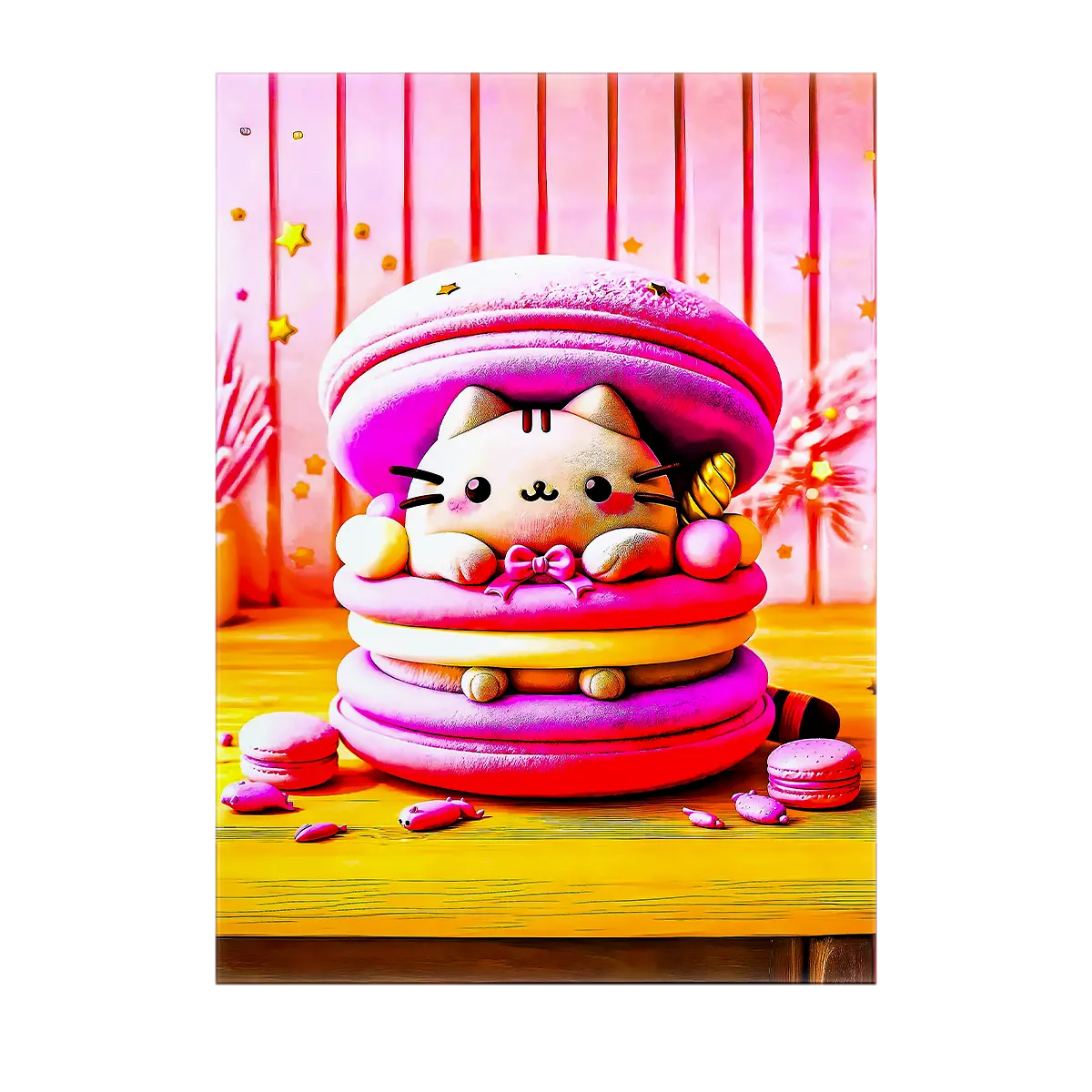Tableau Chat Macaron — Gourmandise féline et douceur pastel