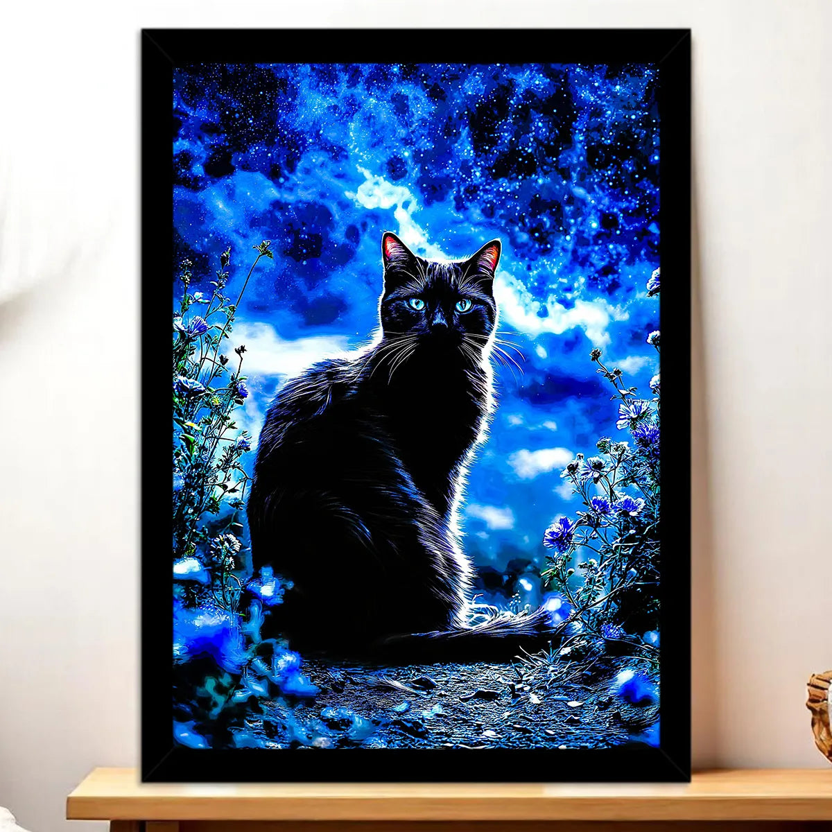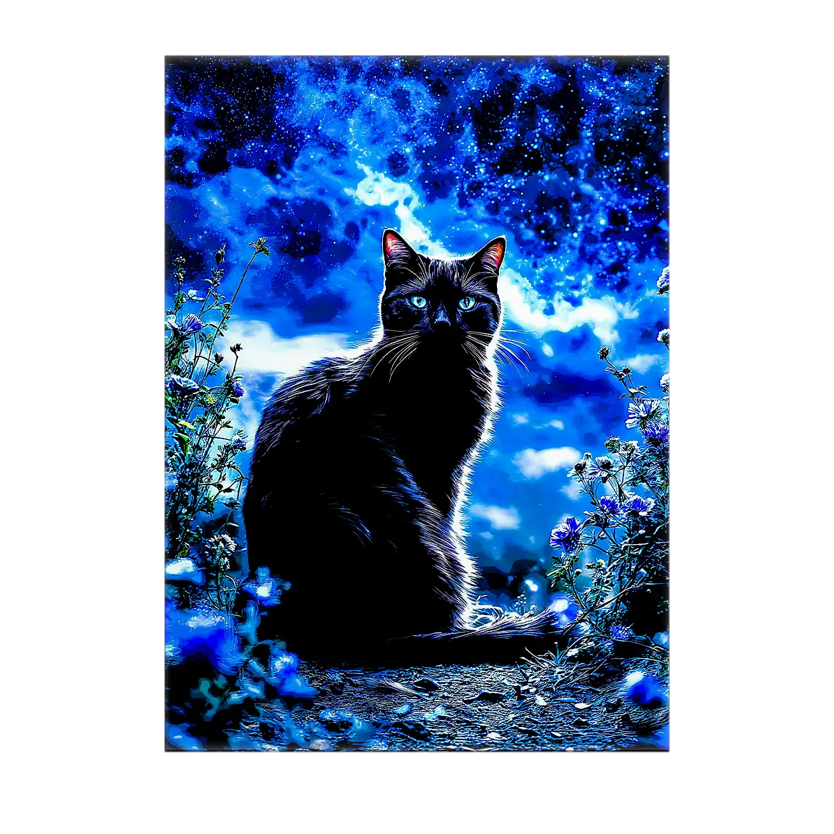 Le poster donne un rendu plus cinématographique et immersif. Idéal pour ceux qui veulent en mettre plein la vue sans se compliquer la vie. L’impression restitue les noirs profonds et les nuances subtiles qui donnent au chat cette aura presque magique. Accroché, il impose une présence et transforme l’espace.