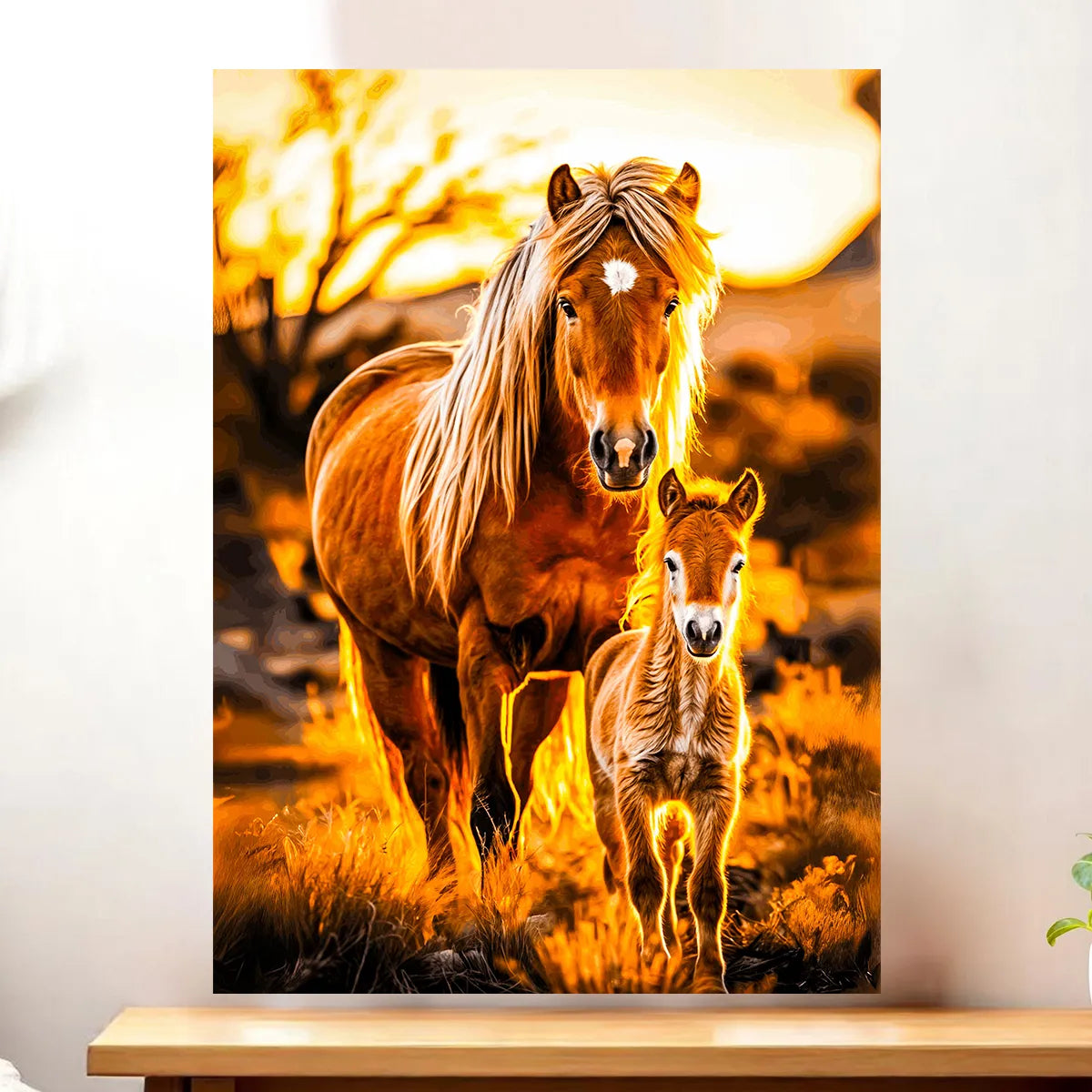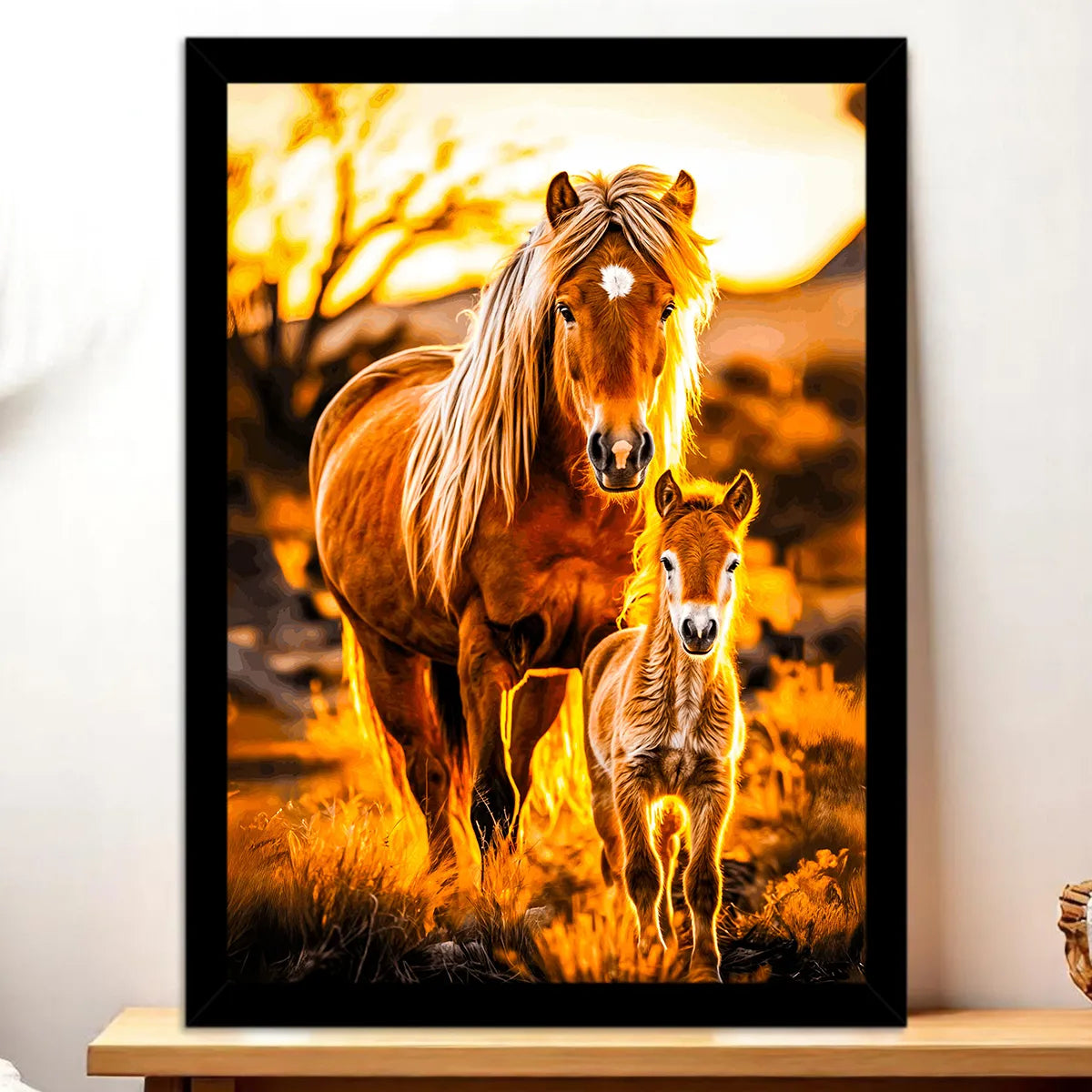 Le tableau est proposé en toile tendue sur châssis en bois FSC, format 21×29 cm. La texture du textile capte la lumière, donne du relief au pelage des chevaux et rend la scène presque palpable. Parfait pour poser sur une étagère ou installer comme pièce centrale au mur.
