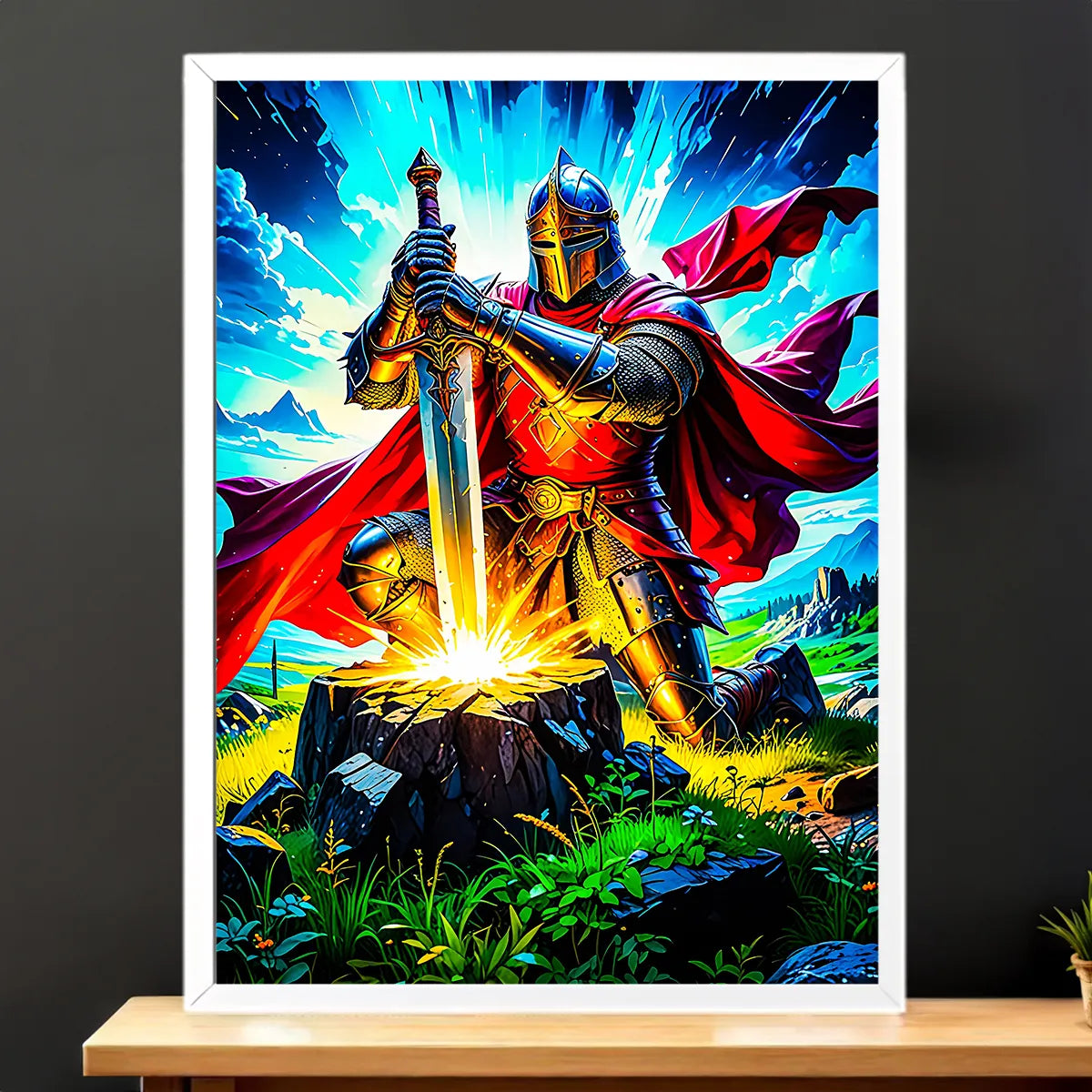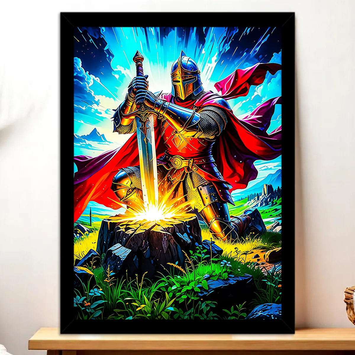 Le tableau est proposé en toile tendue sur châssis bois certifié FSC format 21×29 cm. Le textile de haute qualité restitue les textures de l'armure et les nuances de lumière comme une véritable peinture. Idéal pour créer un point focal dans un bureau, une bibliothèque ou un coin lecture.