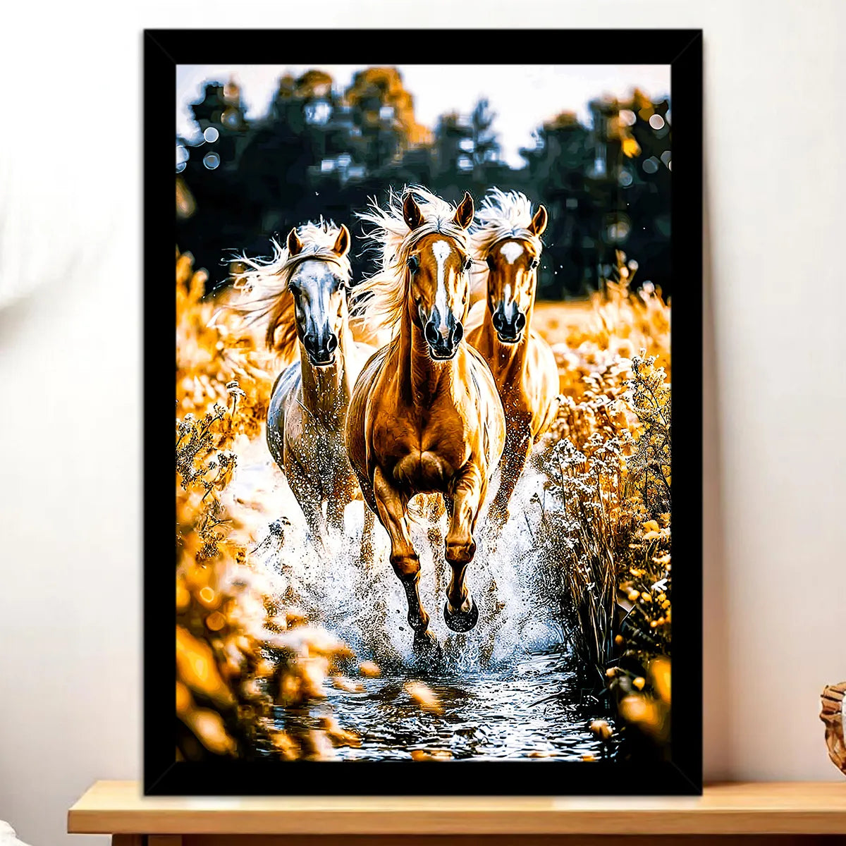 Le tableau est proposé en toile tendue sur châssis en bois FSC format 21×29 cm. La toile textile met en valeur la texture des crinières et la profondeur des contrastes, pour un rendu chaleureux et vivant. Idéal pour créer une ambiance naturelle et authentique dans un salon, un bureau ou une chambre.