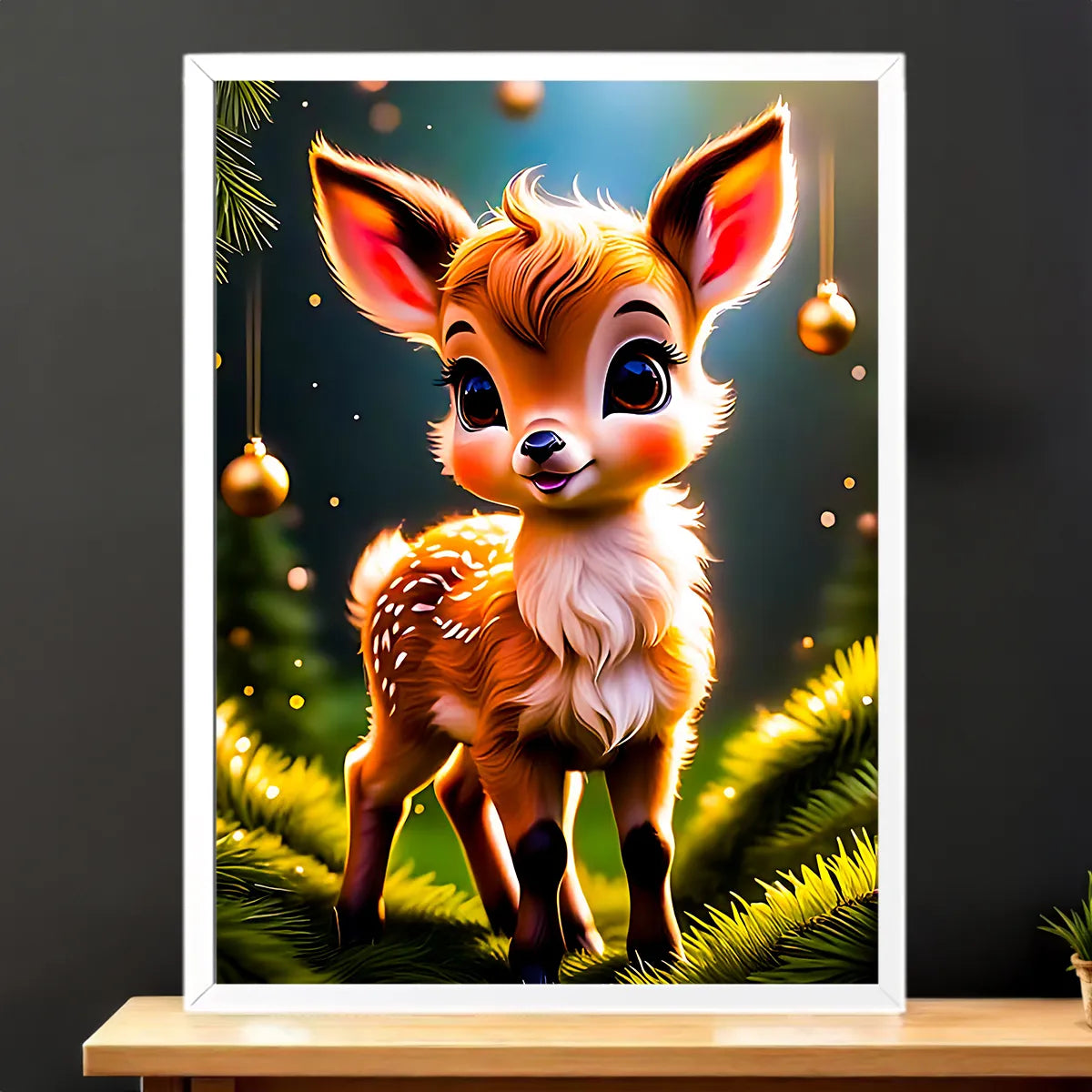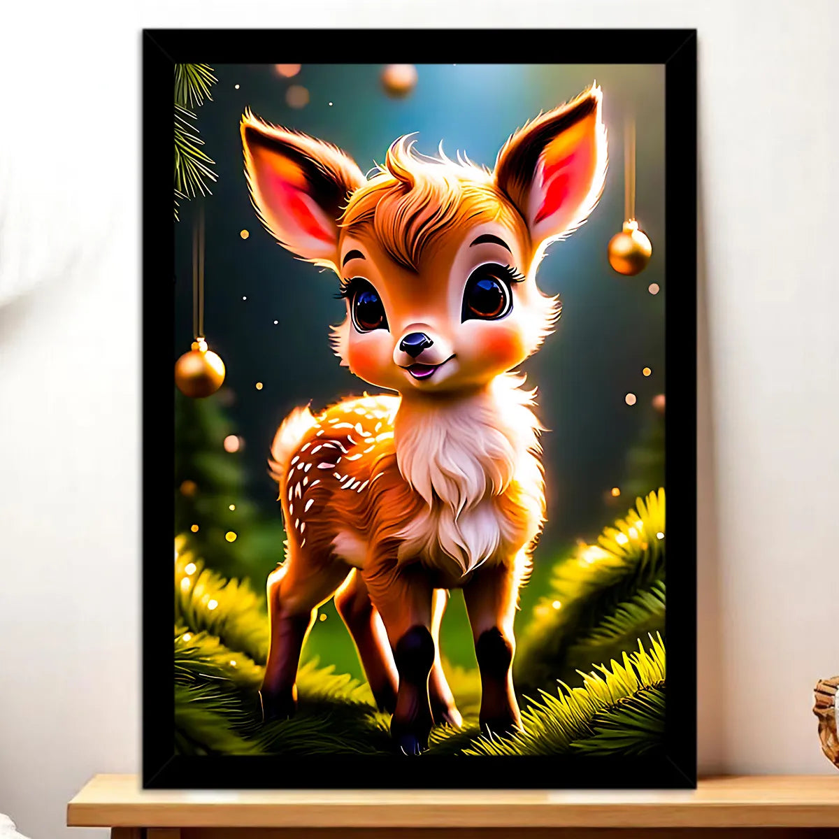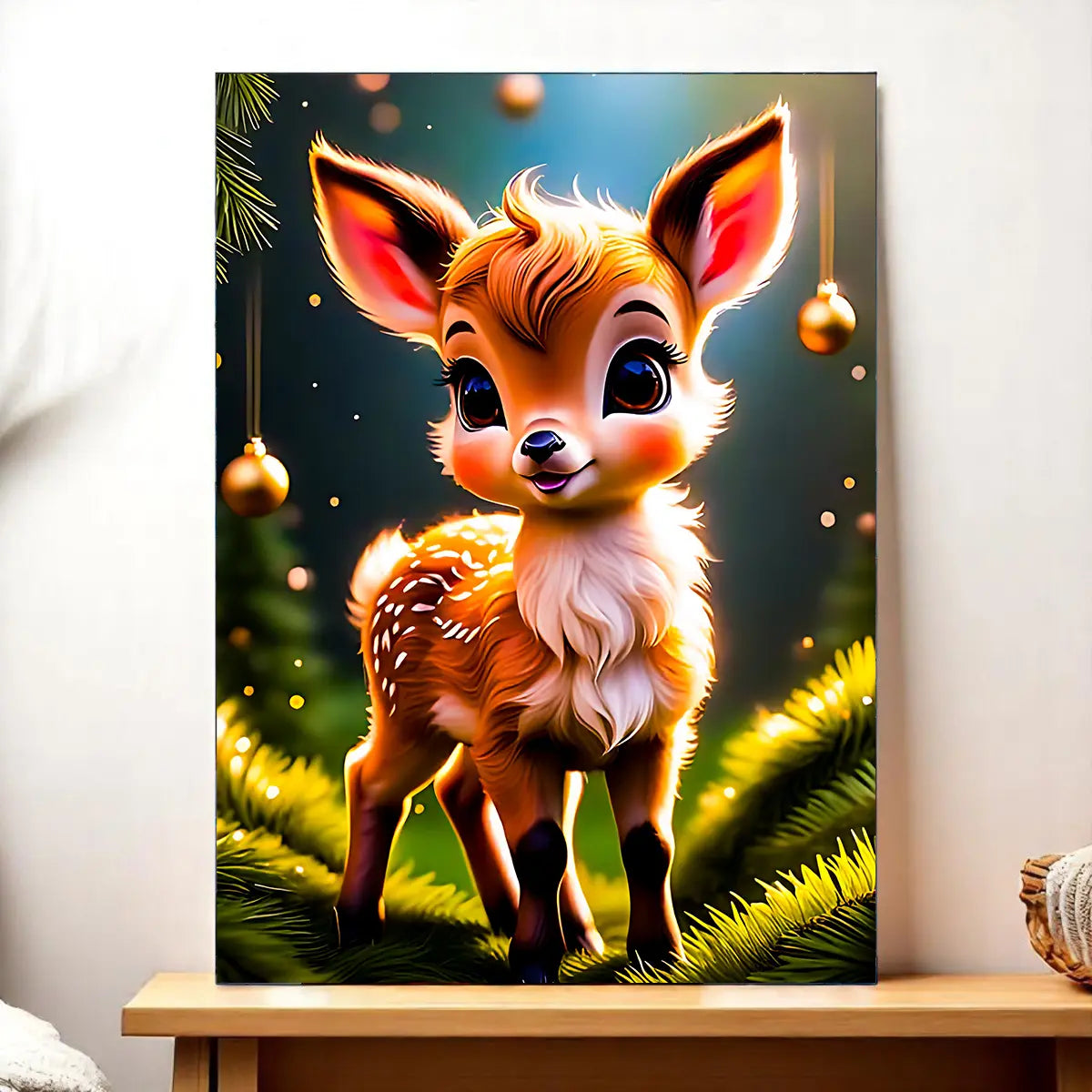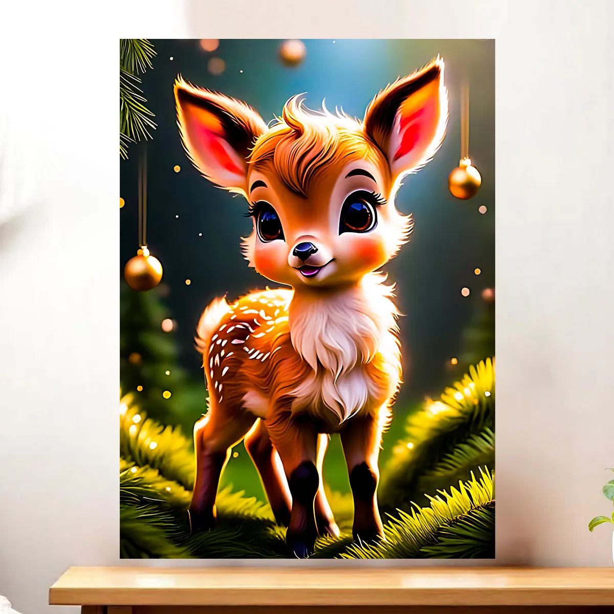 Le tableau est imprimé sur textile de haute qualité et tendu sur un châssis en bois FSC, format 21×29 cm. Le rendu est texturé, légèrement mat, avec une profondeur qui donne vie au pelage délicat du faon. Franchement, on sent presque l'odeur de la mousse.