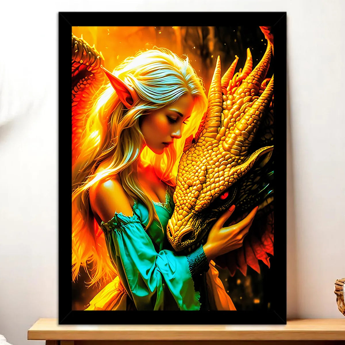 Imagine, on entre dans une pièce et voilà: elle, droite, lumineuse, et lui, le dragon aux écailles qui scintillent comme du métal ancien. Franchement, avouez… ce tableau capte l’œil et l’imaginaire en une seconde. Une scène narrative, tactile, qui raconte l’alliance improbable entre douceur humaine et force brute mythique.