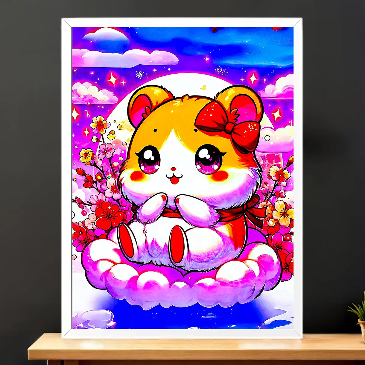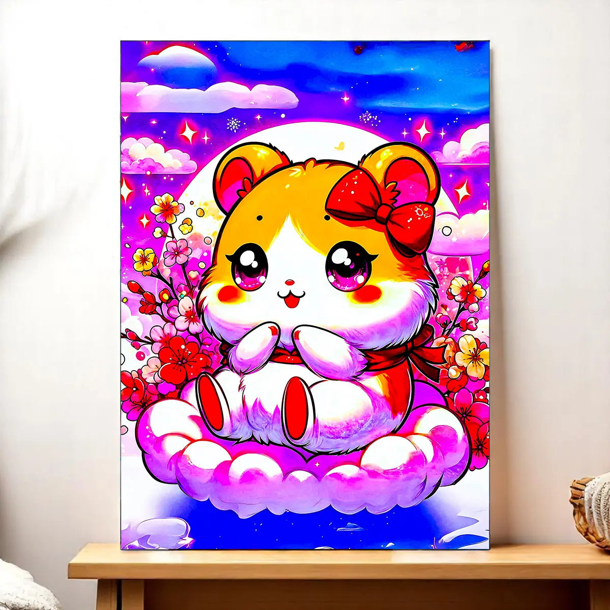 Le tableau est imprimé sur une toile tendue FSC au format exclusif 21×29 cm. Un rendu artistique et texturé qui capte la lumière et transforme Hamtaro en pièce maîtresse douce et élégante. Parfait pour un coin bureau, une chambre ou un petit mur qui mérite une attention kawaii.