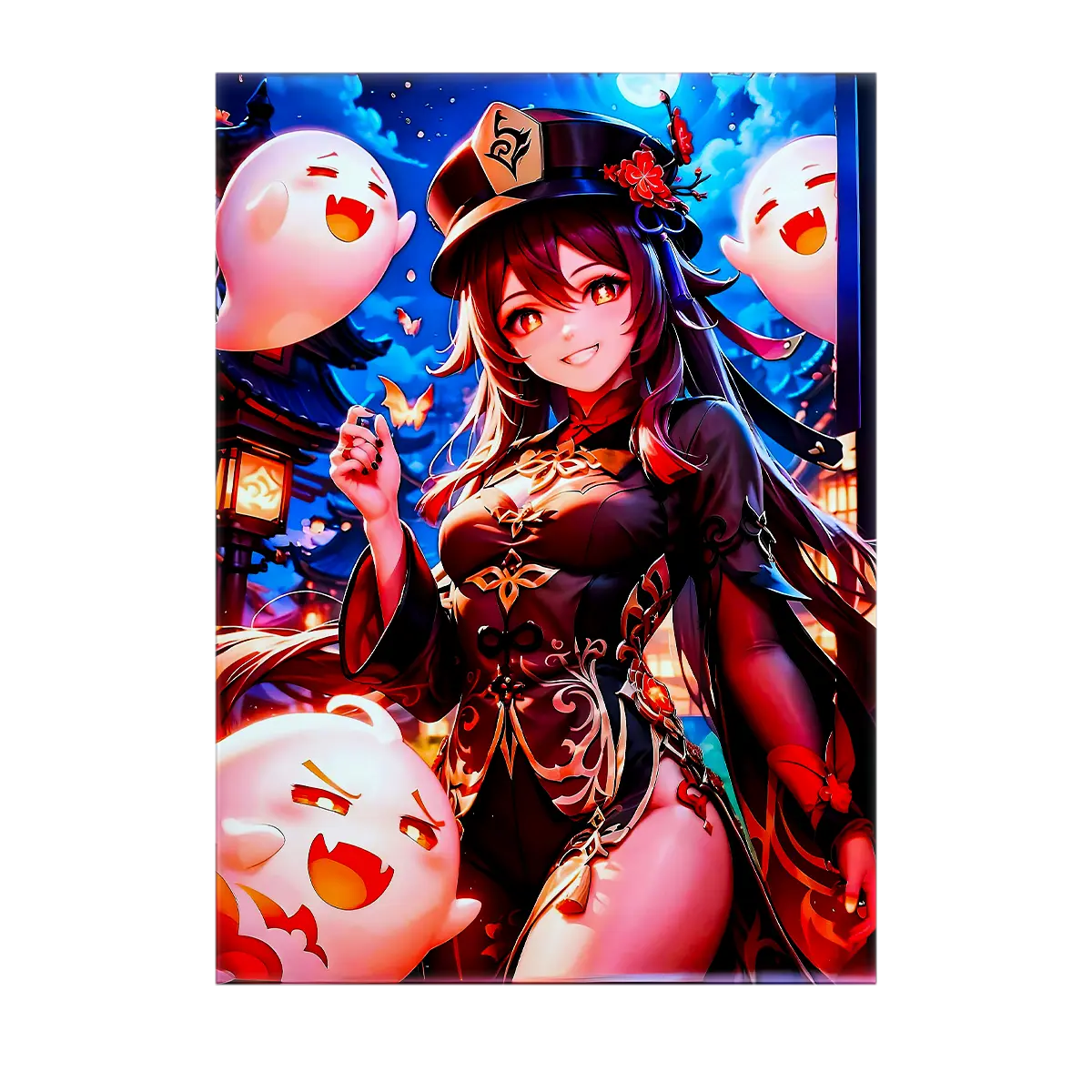L’affiche Hu Tao reprend toute la finesse du visuel, imprimée en HD sur papier photo 200g. Disponible en 10×15, 13×18, 21×29 et 30×40 cm, elle restitue les flammes spirituelles, les détails du costume et ce regard qui sourit comme une promesse de malice. Une option accessible pour varier les cadres et les placements.
