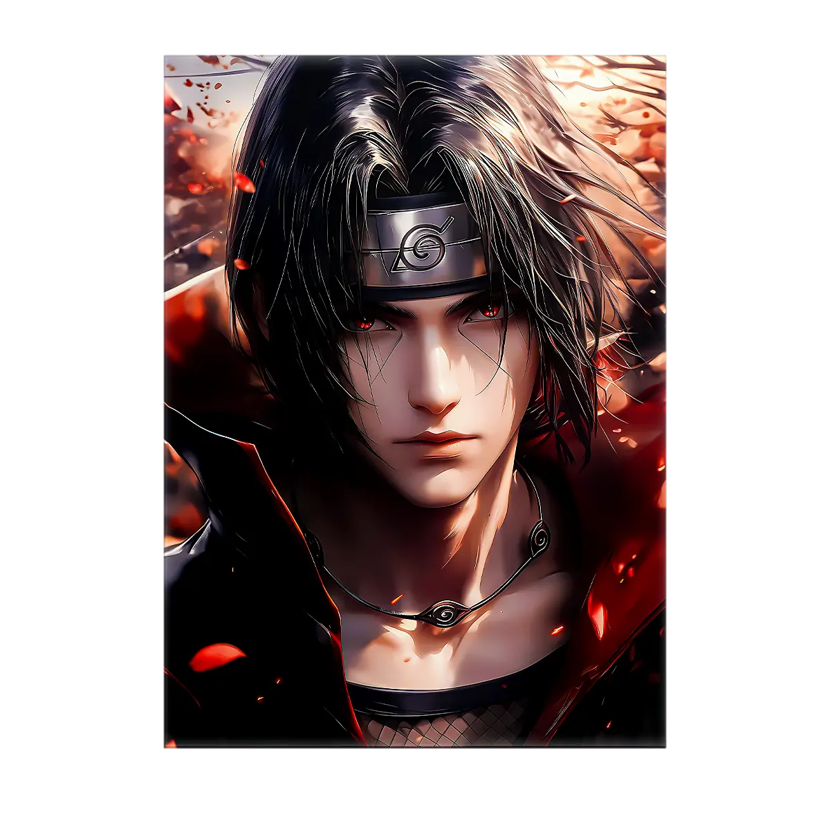L’affiche Itachi est imprimée en HD sur papier photo 200g et proposée en 10×15, 13×18, 21×29 et 30×40 cm. Version accessible et modulable, parfaite pour composer une galerie murale ou changer l’ambiance d’une chambre en un clin d’œil. Les détails du visage, le contraste des ombres et la finesse du trait restent intacts sur papier.