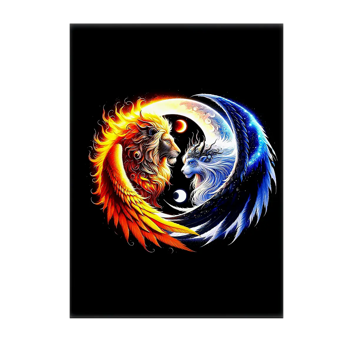 Le tableau est proposé en toile tendue FSC format 21×29 cm. La toile capte la lumière, donne de la profondeur au contraste et offre un grain artistique qui sublime le duo lion et lionne. Idéal pour poser sur une étagère, accrocher derrière un canapé ou enrichir un coin lecture.