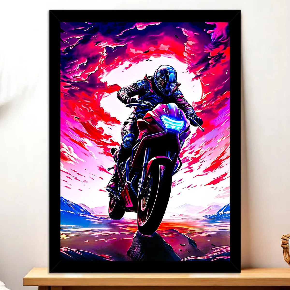 L’affiche reprend le même visuel en impression HD sur papier photo 200g. Disponible en 10×15, 13×18, 21×29 et 30×40 cm, elle se plie à vos envies déco. Version vintage ou moderne, l’affiche moto se glisse partout — salon, garage, coin bar — et change d’ambiance selon l’éclairage.
