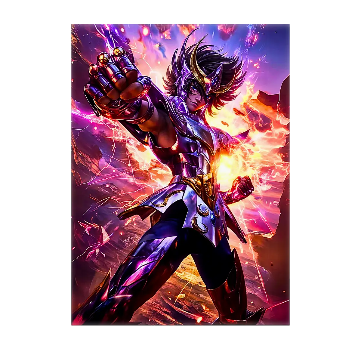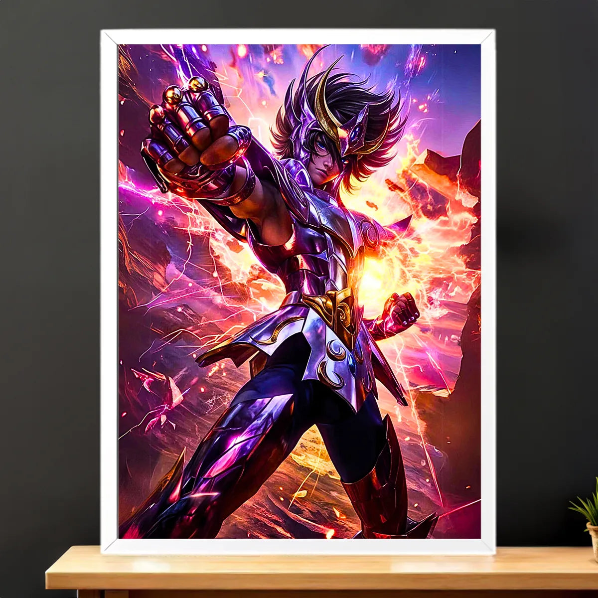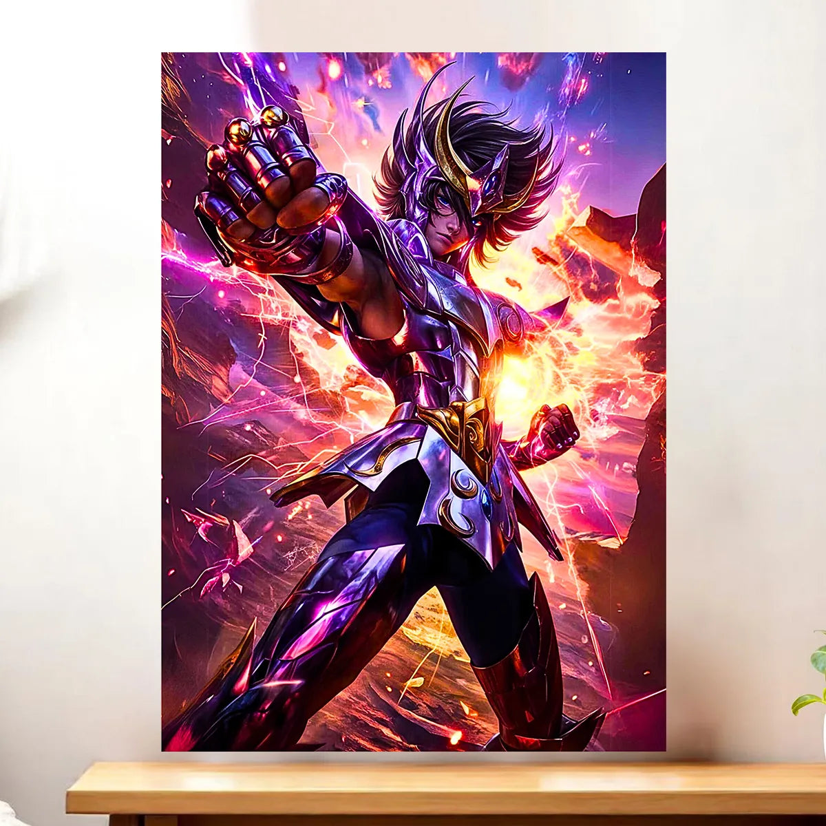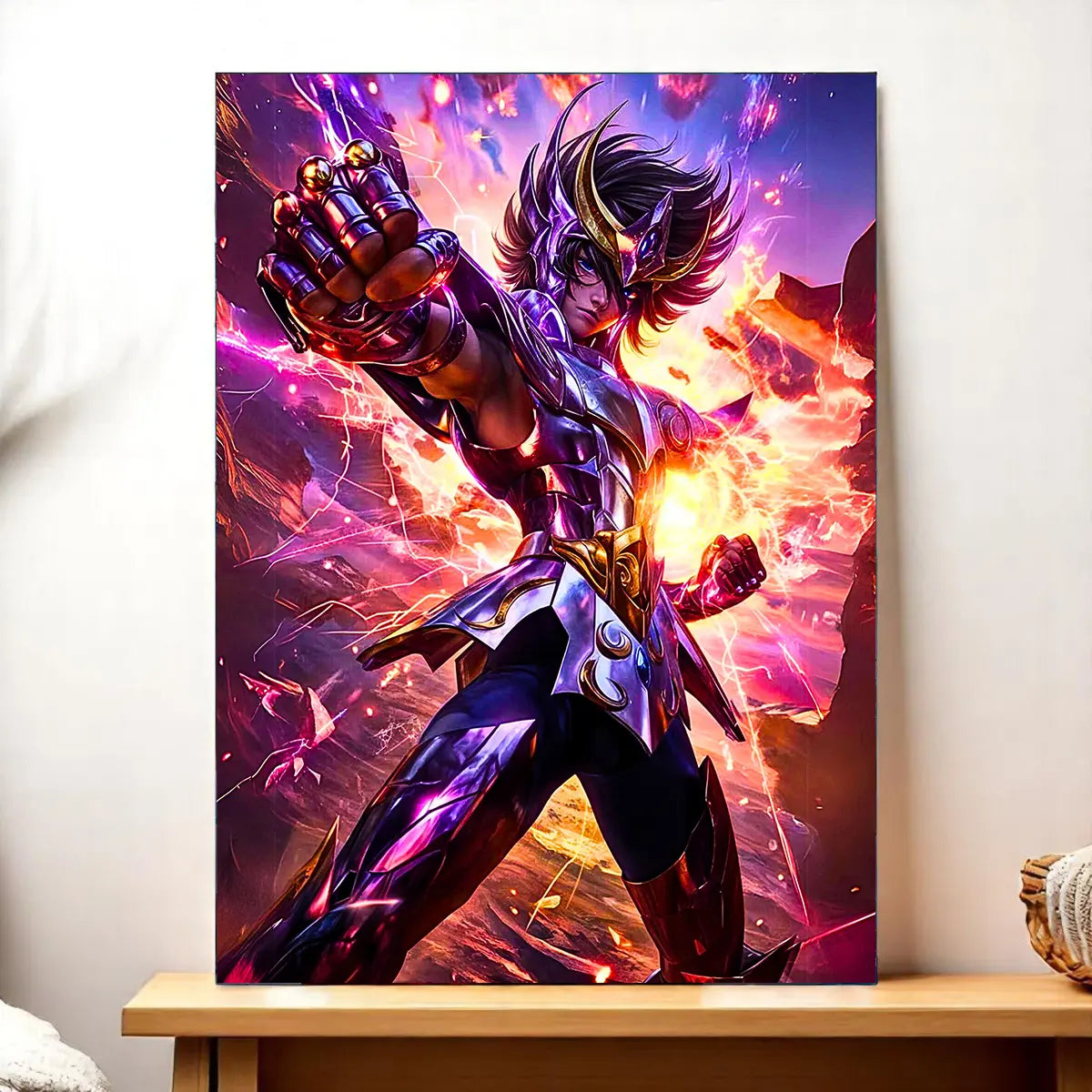 Le tableau est disponible en toile tendue sur châssis bois FSC au format exclusif 21×29 cm. La texture de la toile capte la lumière et restitue les coups d’éclat du casque et des armures. C’est le rendu artistique parfait pour donner du relief et une vraie présence à Seiya dans votre intérieur.